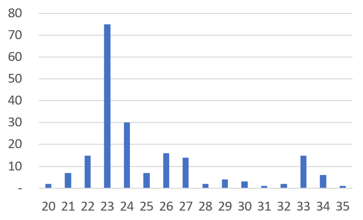 An interesting similarity is discovered. Our Toy Data is scattered around the Normal State (0) while simultaneously forming a separate peak called the Delay State (9). The actual company data is also divided into a peak centered around the average of 23 days, which is the normal lead time, and another (albeit weaker) peak centered around 33 days, which is the delay state.