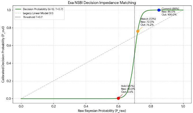 - Interpretation: As the probability reaches 85%, acceleration k works its magic. The system pushes the number 85% up to a 99.9% conviction (Commit) that “This project is a winning business.” The leader has no reason to hesitate anymore.