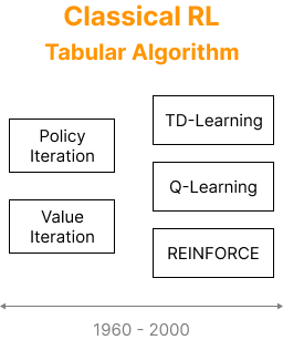 오늘날의 강화학습 알고리즘은 대부분 2000년대 이전의 전통적인 이론과 구조를 기반으로 구축되어 있다. 이러한 전통적 강화학습(Classical RL) 알고리즘들은 주로 Tabular 방식으로 구현되었는데, 이는 상태와 행동의 값을 테이블 형태로 메모리에 저장하고 갱신하는 방식을 의미한다.
