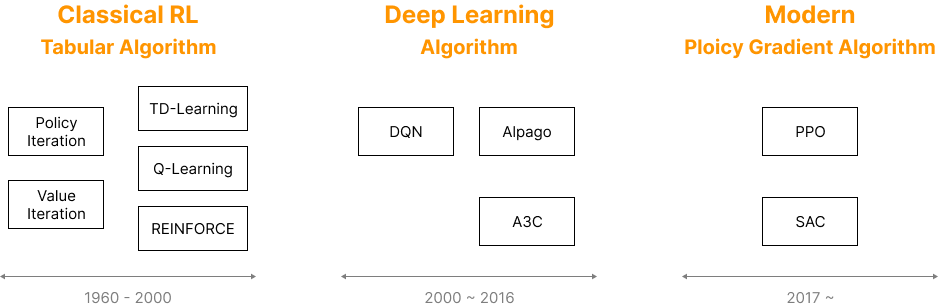 컴퓨터는 1940년대에 등장했고, 1970년대에는 개인용 컴퓨터의 보급이 본격적으로 확산되기 시작했다. 1950~60년대, 초기 컴퓨터 과학자와 소프트웨어 엔지니어들은 컴퓨터가 계산만 잘하는 기계에서 더 나아가, 인간처럼 사고할 수 있는 인공지능을 만들 수 있지 않을까라는 질문을 던지기 시작했다. 이 시기에는 데이터 기반의 예측과 분류를 수행하는 머신러닝 학파와 함께, 시행착오(Trial-and-Error)를 통해 최적의 행동을 학습하고자 하는 강화학습 학파가 동시에 존재했다. 이미 1950년대부터 머신러닝과 더불어 강화학습에 대한 연구가 병행되었으며, 2000년대에 들어서는 우리가 현재 알고 있는 대부분의 핵심 이론과 알고리즘이 이미 완성된다. 이후, 강화학습은 딥러닝과 결합하며 다시 한 번 비약적인 발전을 이루게 된다.